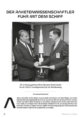 Anfang April sollen mit der Mission Artemis II wieder Astronauten zum Mond fliegen, zum ersten Male seit 1972. Zwangsläufig fällt damit auch neuerlich der Blick auf die Geschichte der amerikanischen Raumfahrt. Dabei ist bislang nur sporadisch wahrgenommen worden, dass Heinz Hermann Koelle, ein wichtiger Akteur des damaligen »Wettlaufs ins All«, aus Danzig stammte. Umso lohnender erscheint es, diesen Forscher, dessen 100. Geburtstag jüngst die Aufmerksamkeit der Fachwelt wieder erregt hat, hier eingehender zu würdigen.
