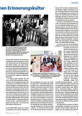 An die Jubiläumsfeier schloss sich zunächst ein Empfang und im weiteren Verlauf des Tages ein Symposion an, in dem sich ein relativ großer Kreis von Diskutanten die Aufgabe stellte, zum 50. Jahrestag des WLM dessen »Tradition und Zukunft« miteinander »im Dialog« zu bedenken und zu entfalten. – Zunächst hielten drei Teilnehmer jeweils Impulsreferate über die Themen: Das Westpreußen-Museum: ein Mitglied der großen »96-er Familie« (Dr. Roland Borchers, Berlin), Die Geschichte des Hauses, thematische Bruchstellen und veränderte Perspektiven (Prof. Dr. Erik Fischer, Bonn) und Chancen einer Öffnung und Weiterentwicklung (Martin Koschny M. A., Warendorf). Nach diesen einführenden Kurzvorträgen äußerten – unter der Moderation von Dr. Vincent Regente (Berlin) – Dr. Hermann Arnhold, der Direktor des LWL-Museum für Kunst und Kultur in Münster, Prof. Dr. Bettina Schlüter, Direktorin der Abteilung »Digitale Gesellschaft« im Forum internationale Wissenschaft der Universität Bonn, sowie Wolfgang Türk als Leiter des Kulturamts der Stadt Warendorf eine Reihe von Rückfragen und eigenen Statements, so dass sich tatsächlich ein intensiver, auch kritischer und selbstkritischer Dialog entfaltete.